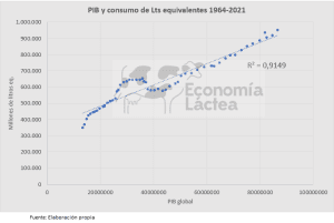 Desde Economía Láctea siempre observamos y comunicamos a nuestros clientes la importancia de seguir la tendencia del PBI de los países y el global ya que se trata de una de las variables que más correlaciona con el consumo de productos lácteos como se puede ver en el siguiente gráfico.