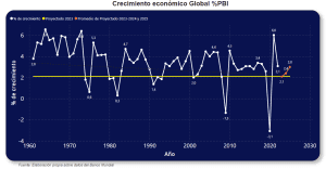 Las últimas proyecciones del Banco Mundial indican que la economía mundial se mantendrá frágil, y con riesgo de una caída más profunda durante 2023 y 2024. El escenario base prevé que el crecimiento global disminuirá del 3,1% de 2022 a 2,1% en 2023, para luego aumentar ligeramente al 2,4% en 2024.